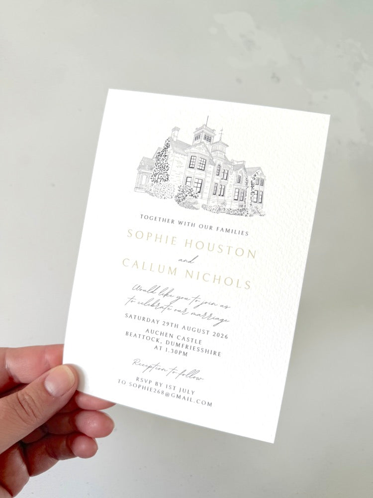 Hand drawn digital venue illustrations available on a range of wedding invite styles
