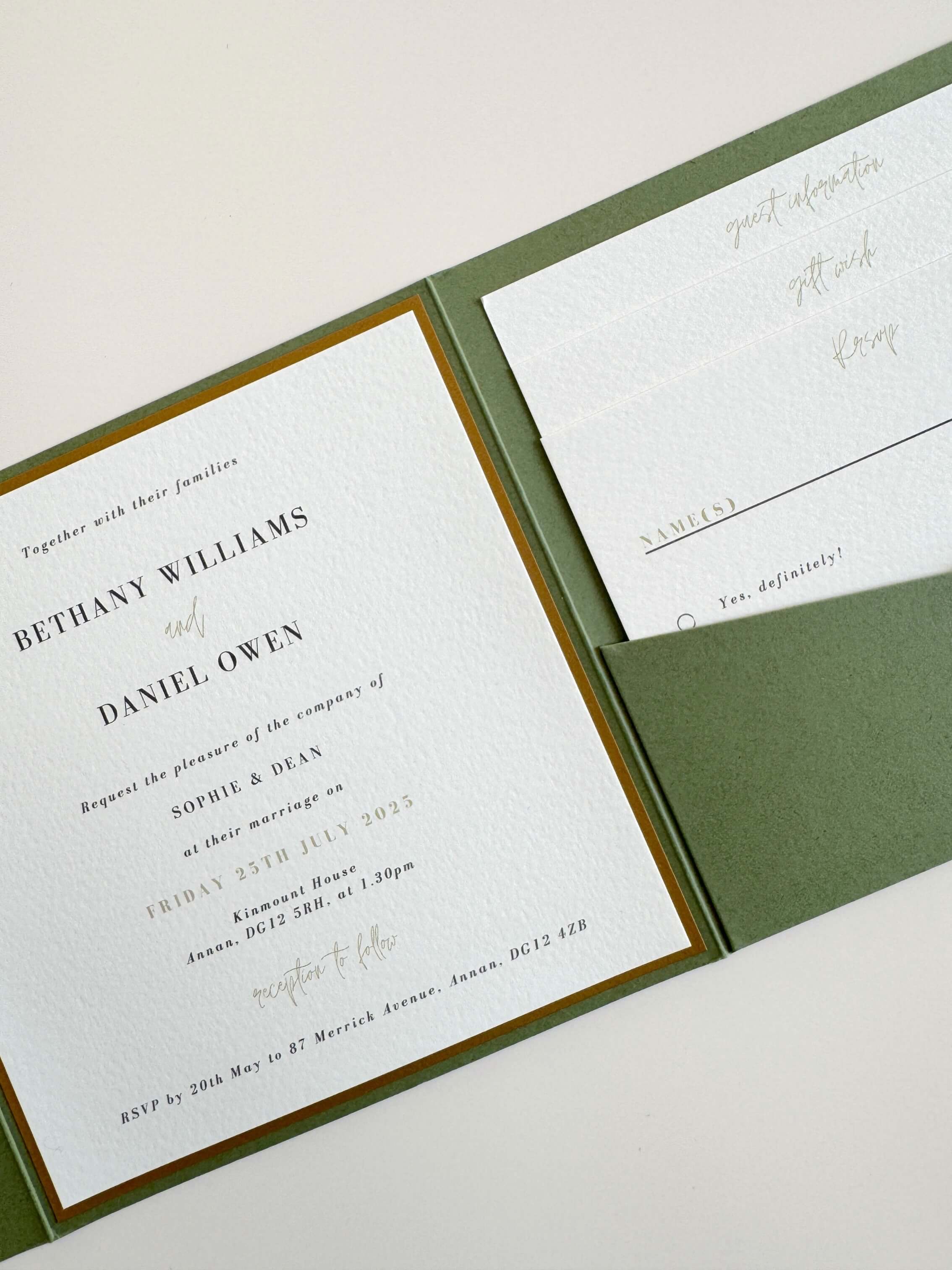 This square pocketfold invitation comes with your choice of finishing touches including a handmade satin or silk ribbon, and a wax seal.