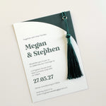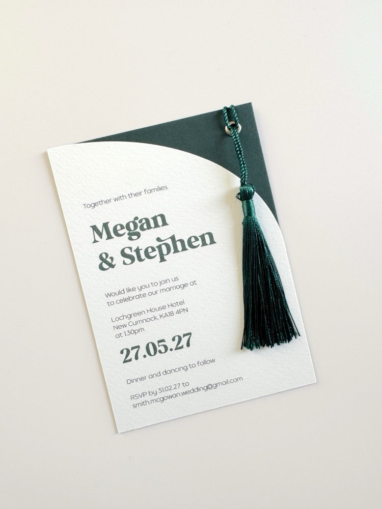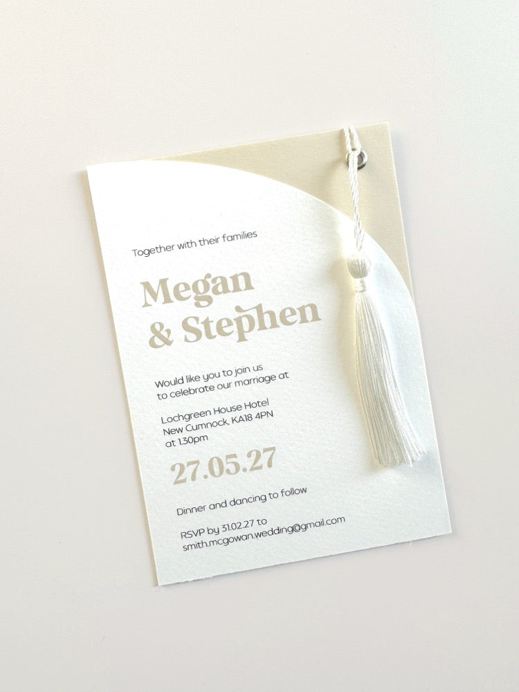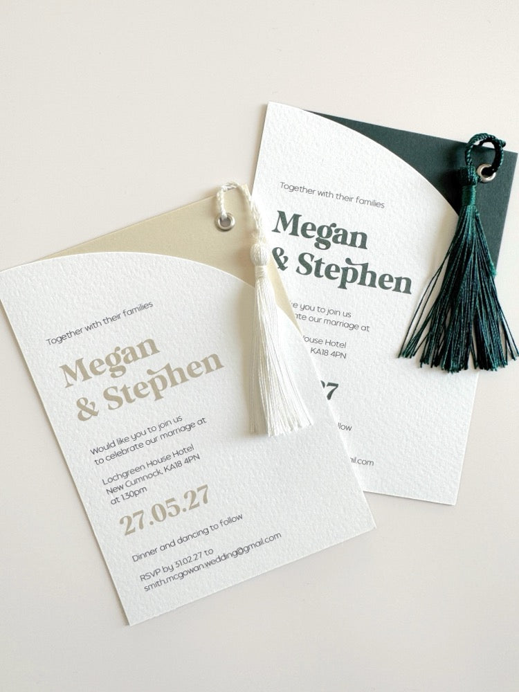 A modern wedding invite with half arch style, tassel and metal eyelet. Printed with a matching colour on a textured white 300gsm card. Choose the eyelet colour to help personalise the design.