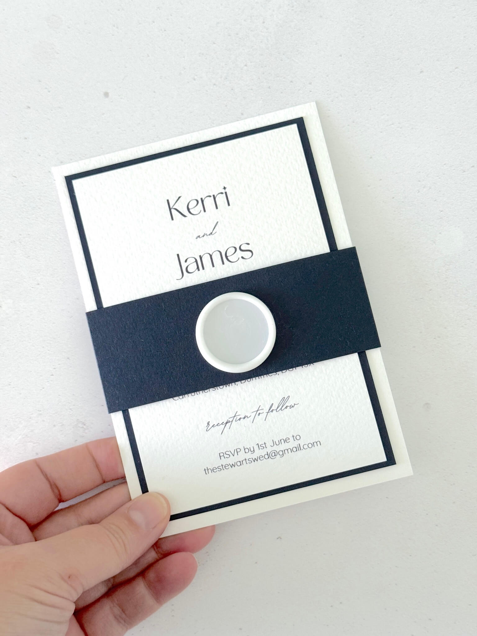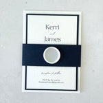 This neatly layered invitation is contained by a belly band with handmade wax seal, which then slides off to allow your guests to access all the cards. 2 info cards provides space for your invite, and all the details you need to tell your guests (like menu options, accommodation details, and gift wishes, etc).