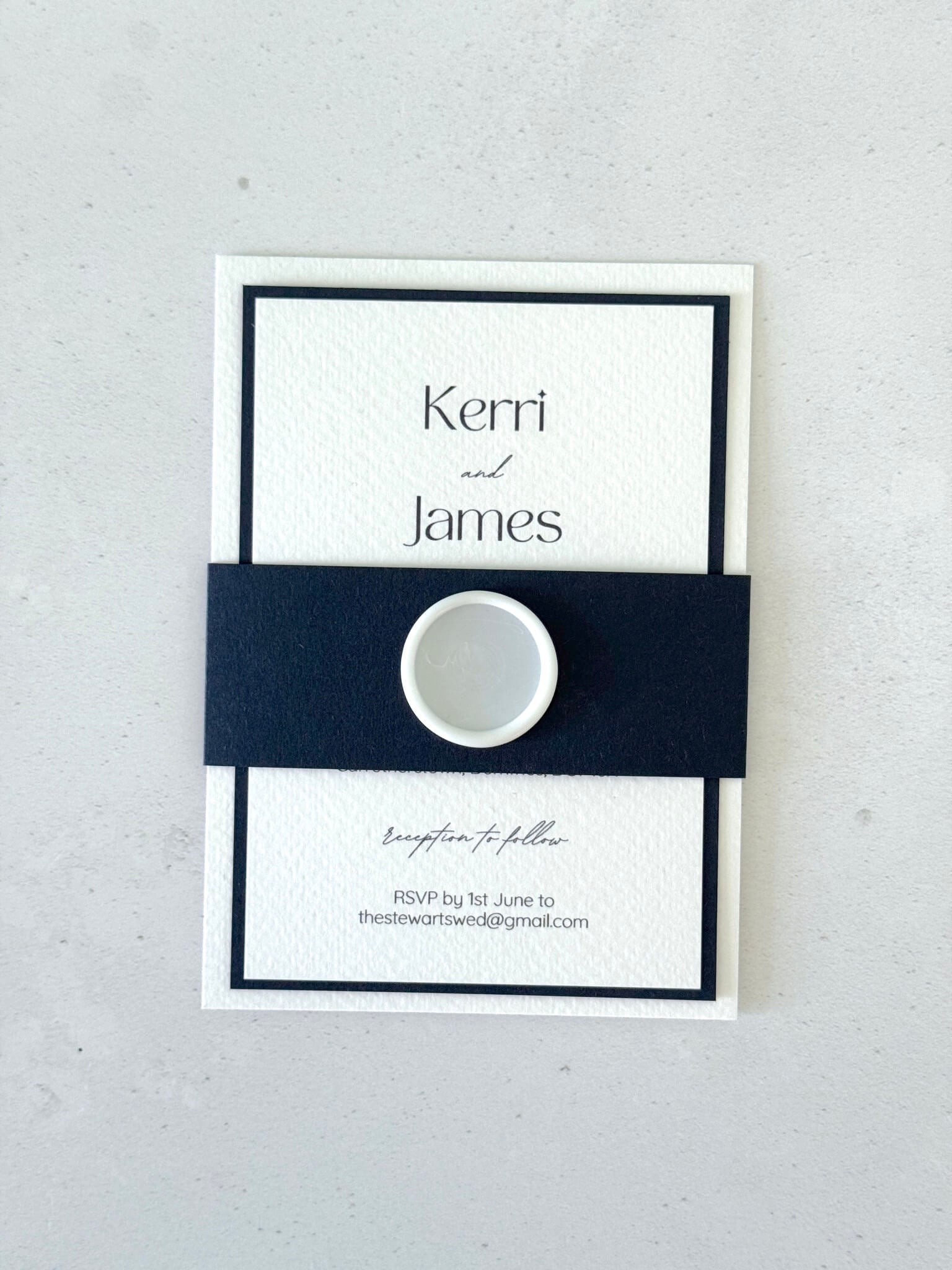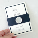 navy and white postcard wedding invite and details card with belly band and wax seal