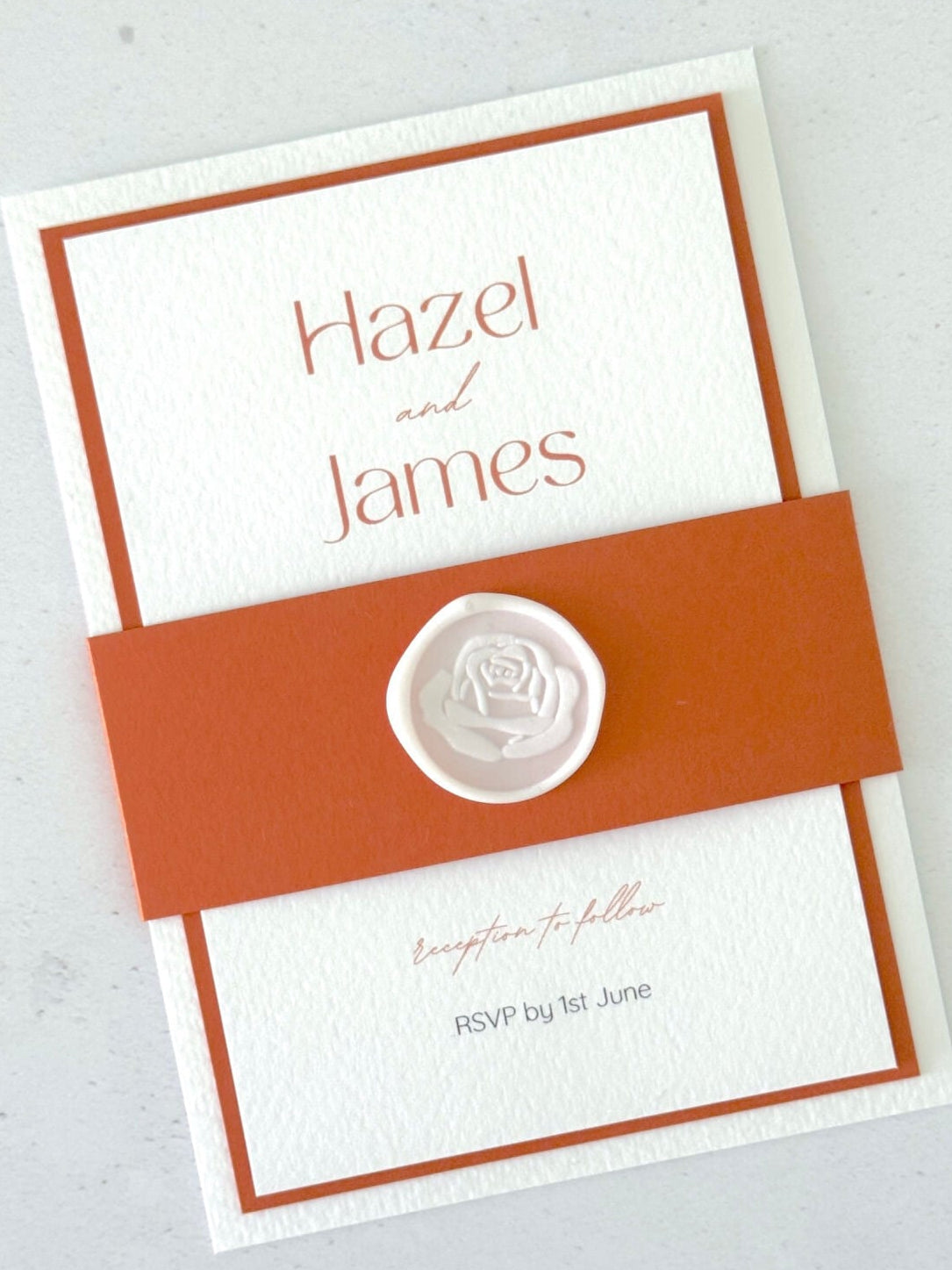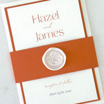Lyn wedding invite with terracotta orange belly band and white wax seal