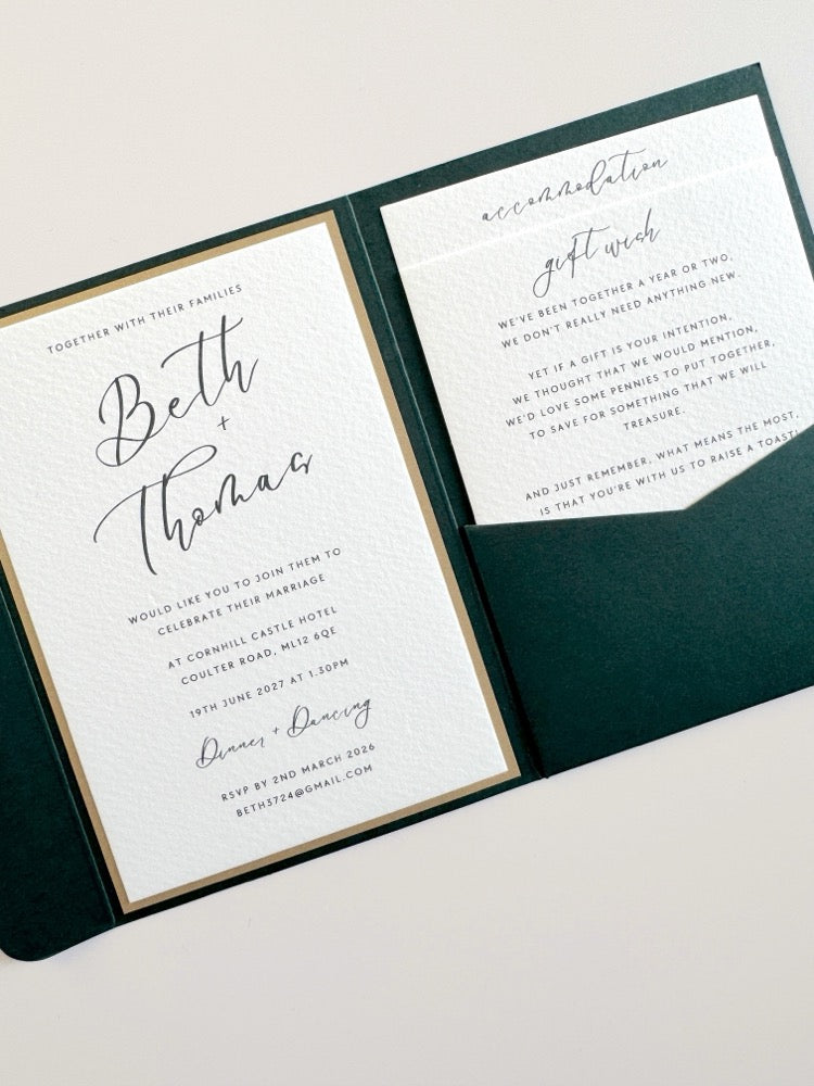 With its minimalist design, modern calligraphy style font, and simple pocket fold this is one of my most popular handmade wedding invitations. Available in 9 colours.