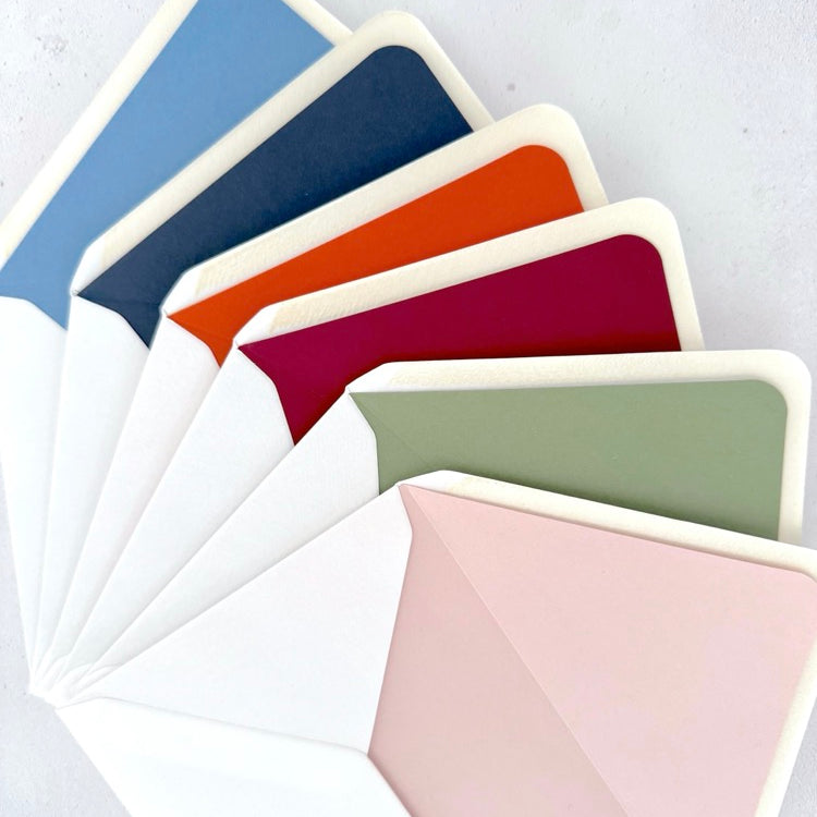 All invites come with a white envelope, but you can add different finishing touches, like vellum wraps, wax seals, and silk or satin ribbons, to customise your look.