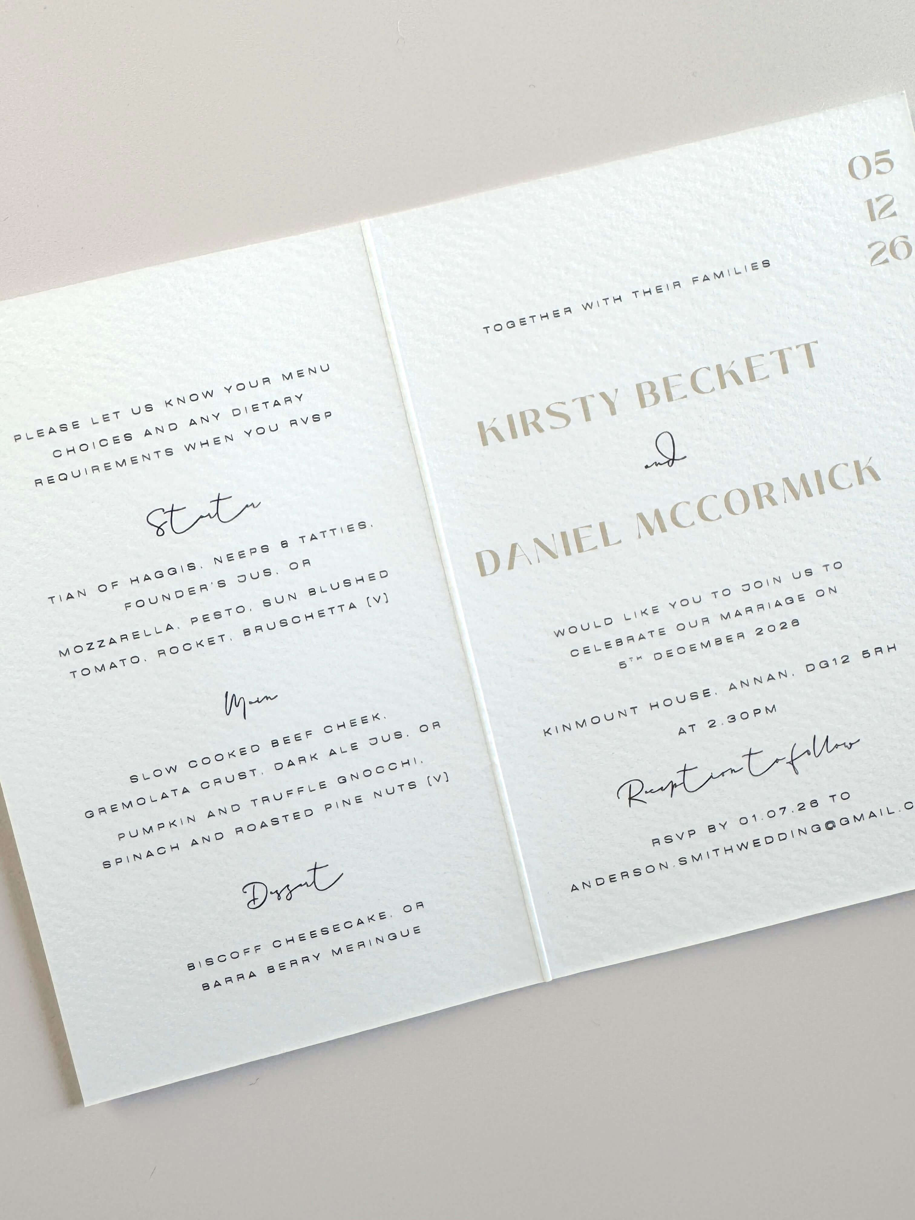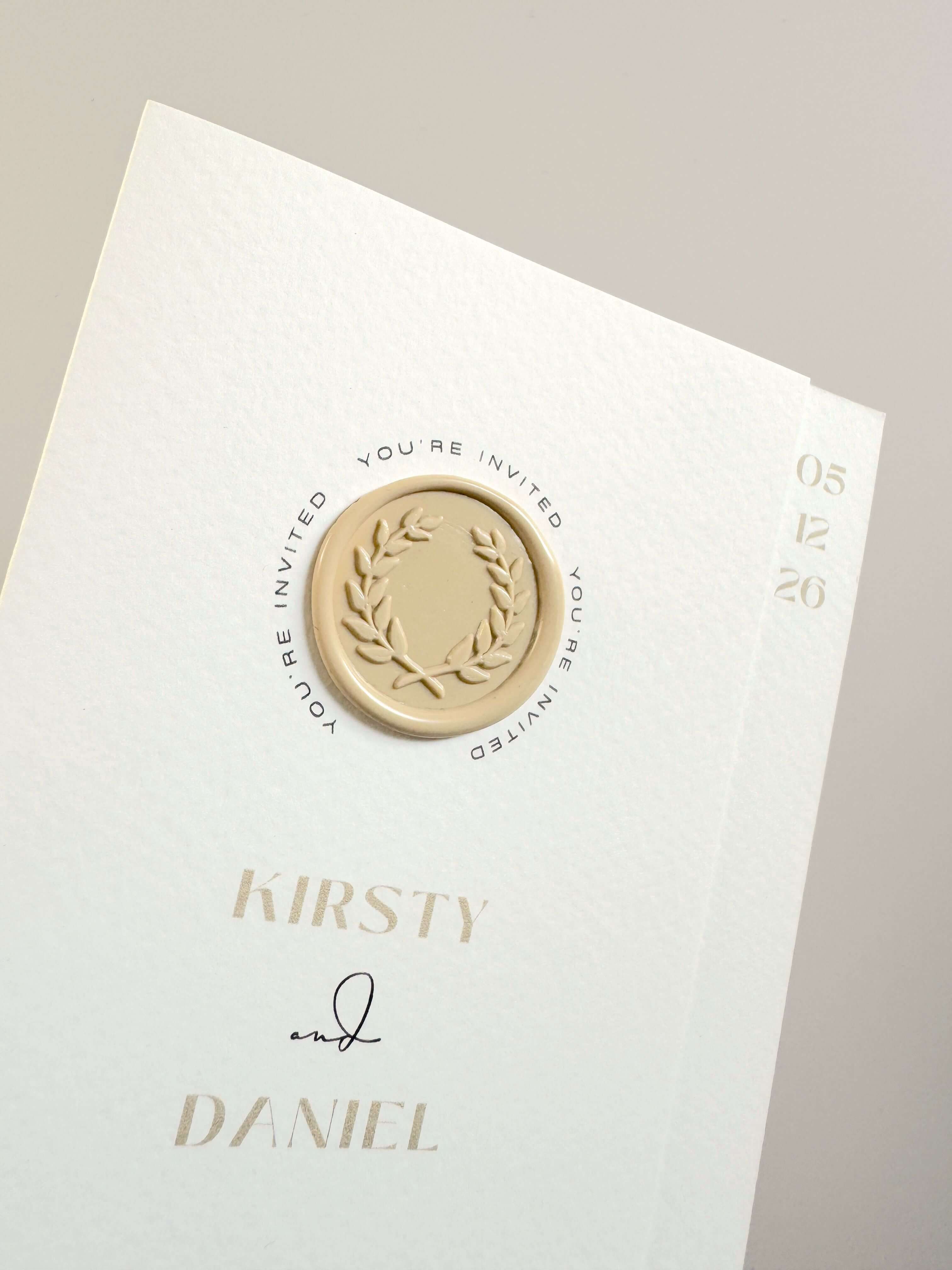A modern folded style wedding invite with handmade wax seal. Printed with a matching colour on a textured white 300gsm card.