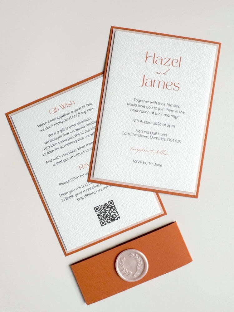 This neatly layered invitation is contained by a belly band with handmade wax seal, which then slides off to allow your guests to access all the cards. 2 info cards provides space for your invite, and all the details you need to tell your guests (like menu options, accommodation details, and gift wishes, etc).